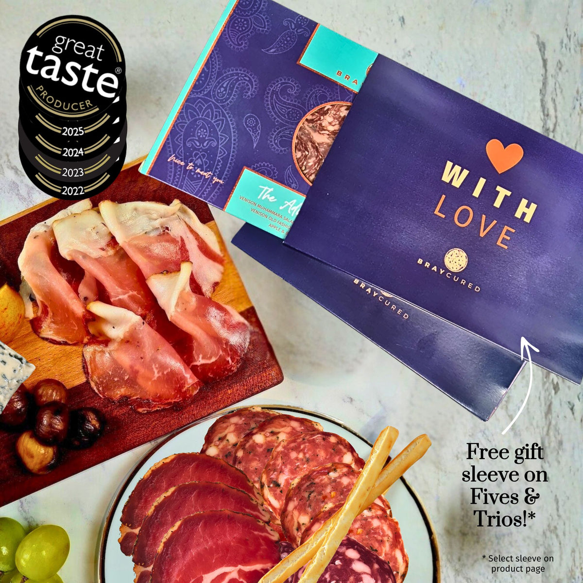 Each slice is a labour of love, handcrafted and slowly cured. We’ve added a romantic touch this year: our 'With Love' gifting sleeves are now available for our Tasting Trio and Feasting Five selections.