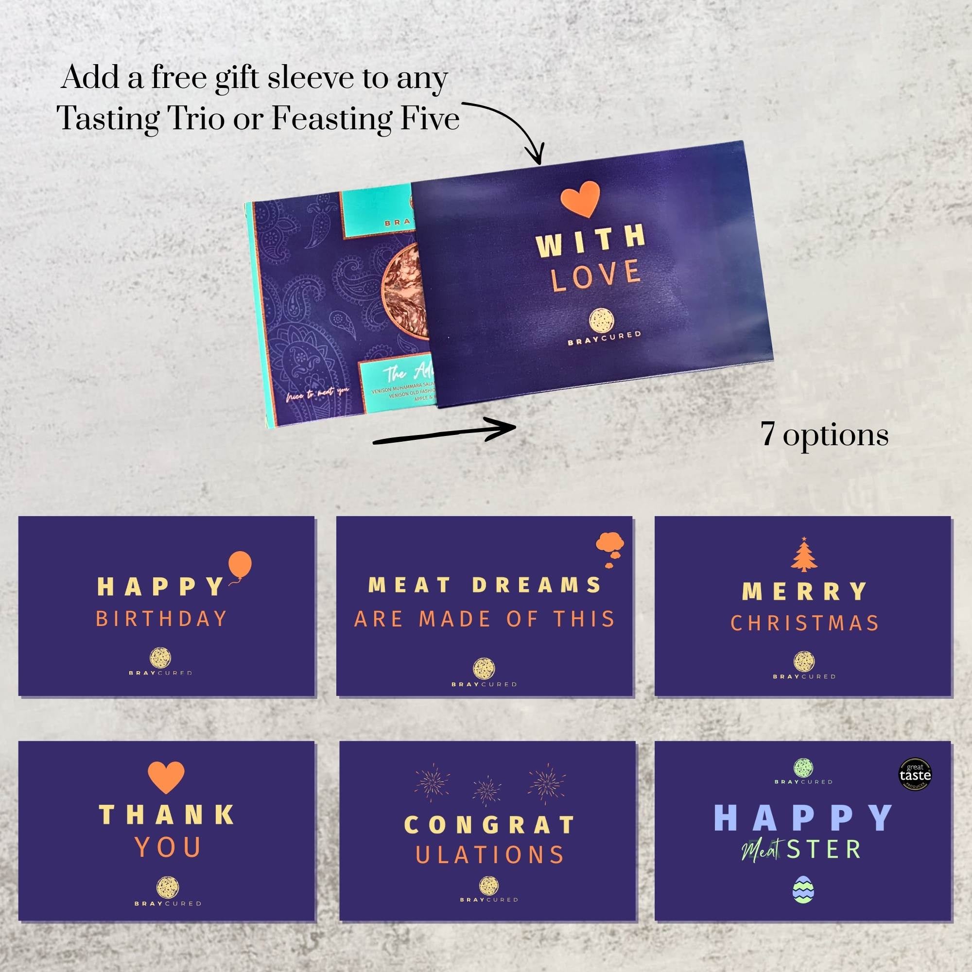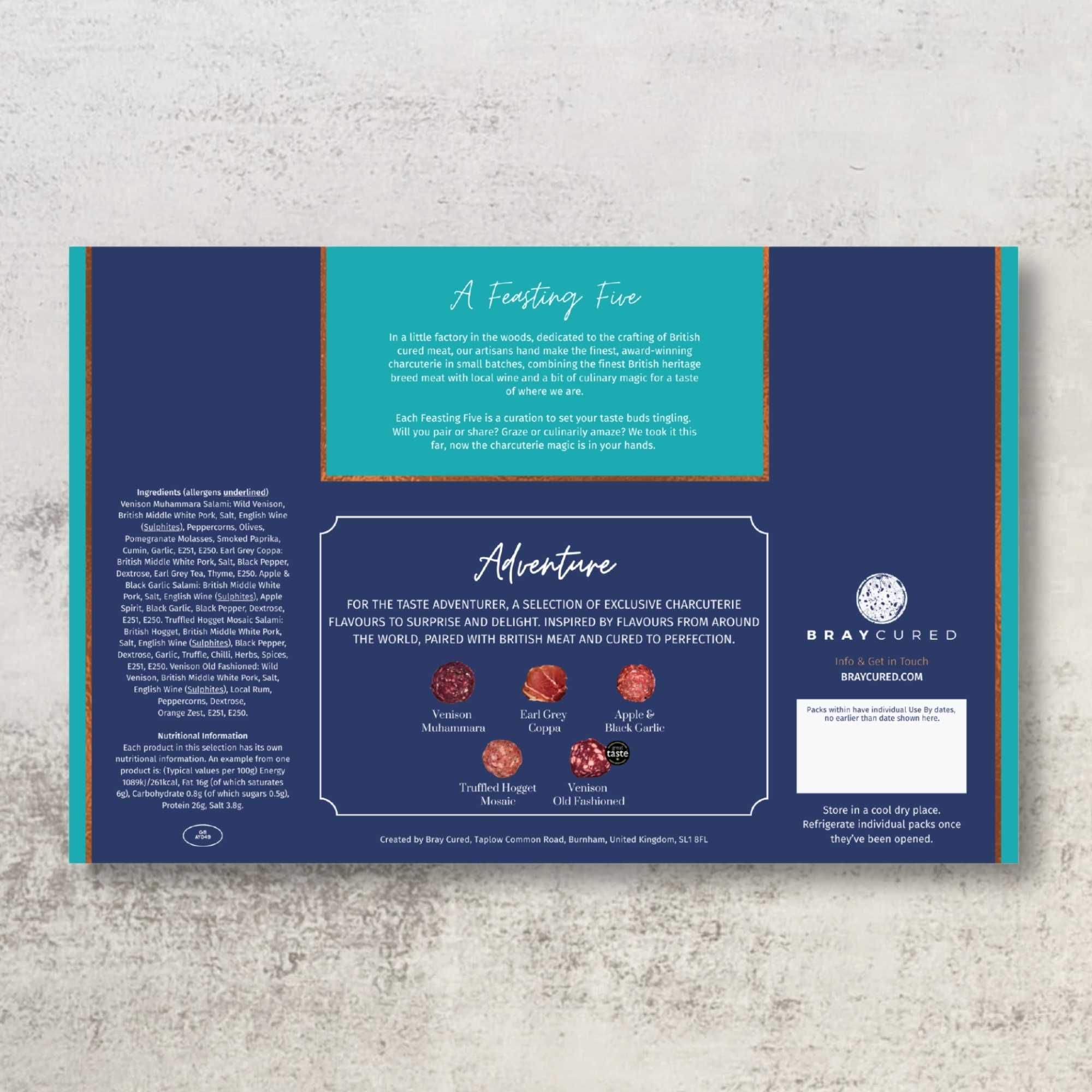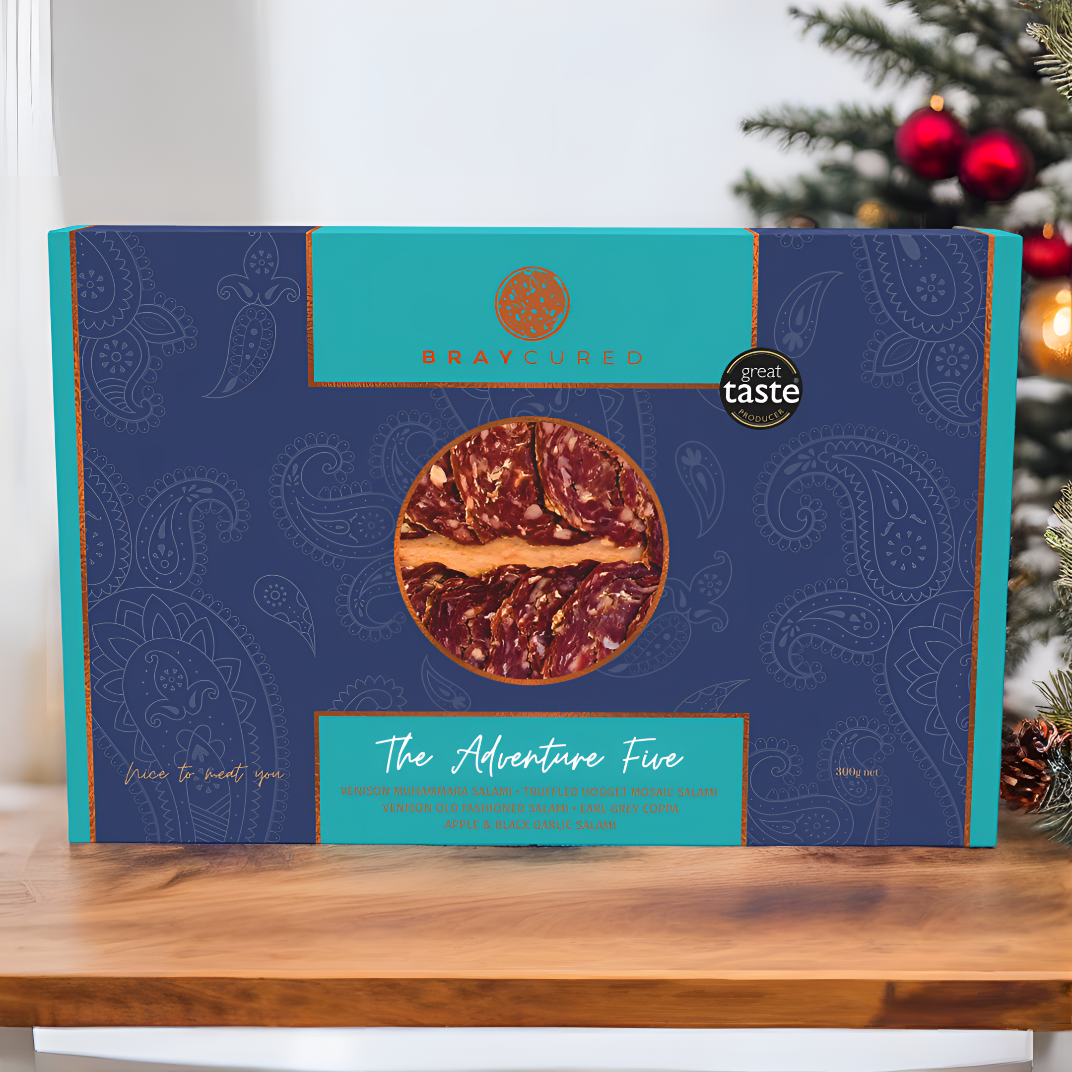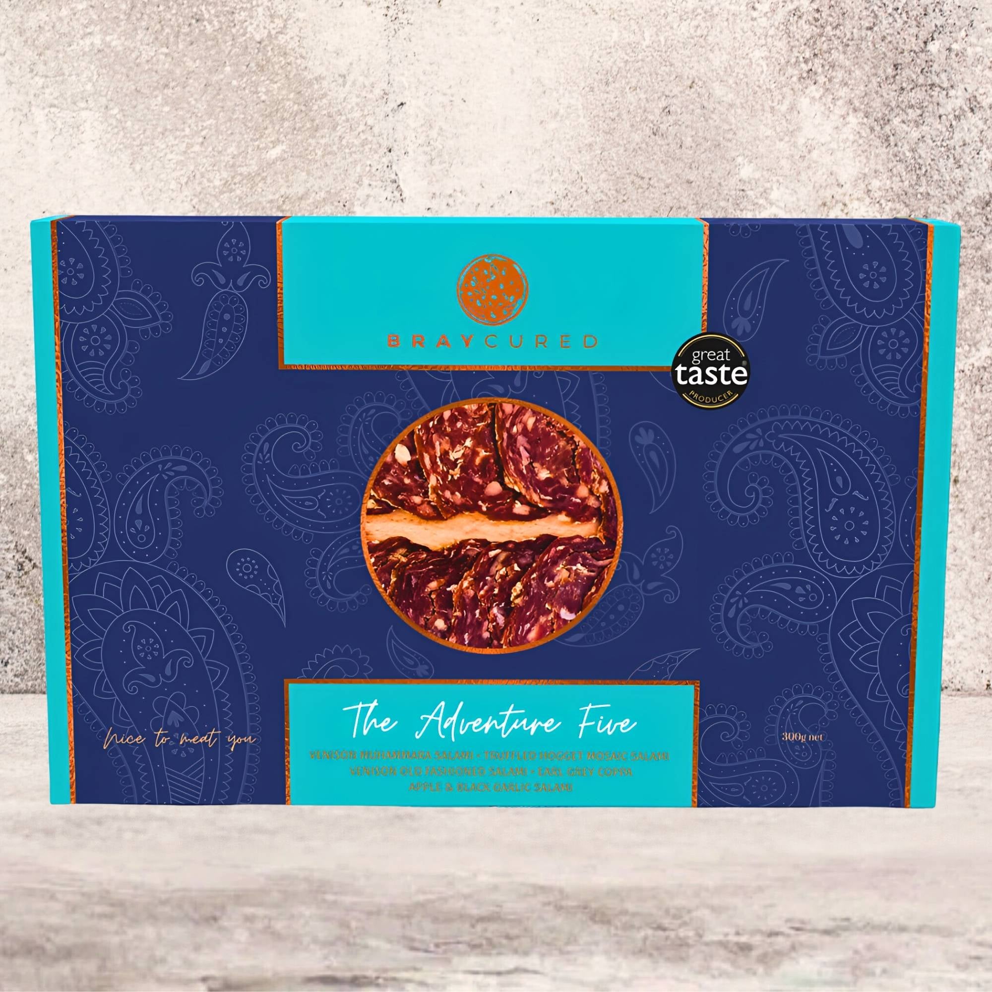 For the taste adventurer, a selection of exclusives to surprise and delight. Beautifully gift boxed, this five combines a 60g pack of our Venison Muhammara Salam, Earl Grey Coppa, Apple & Black Garlic Salami, Venison Old Fashioned Salami and Hogget Merguez Salami.