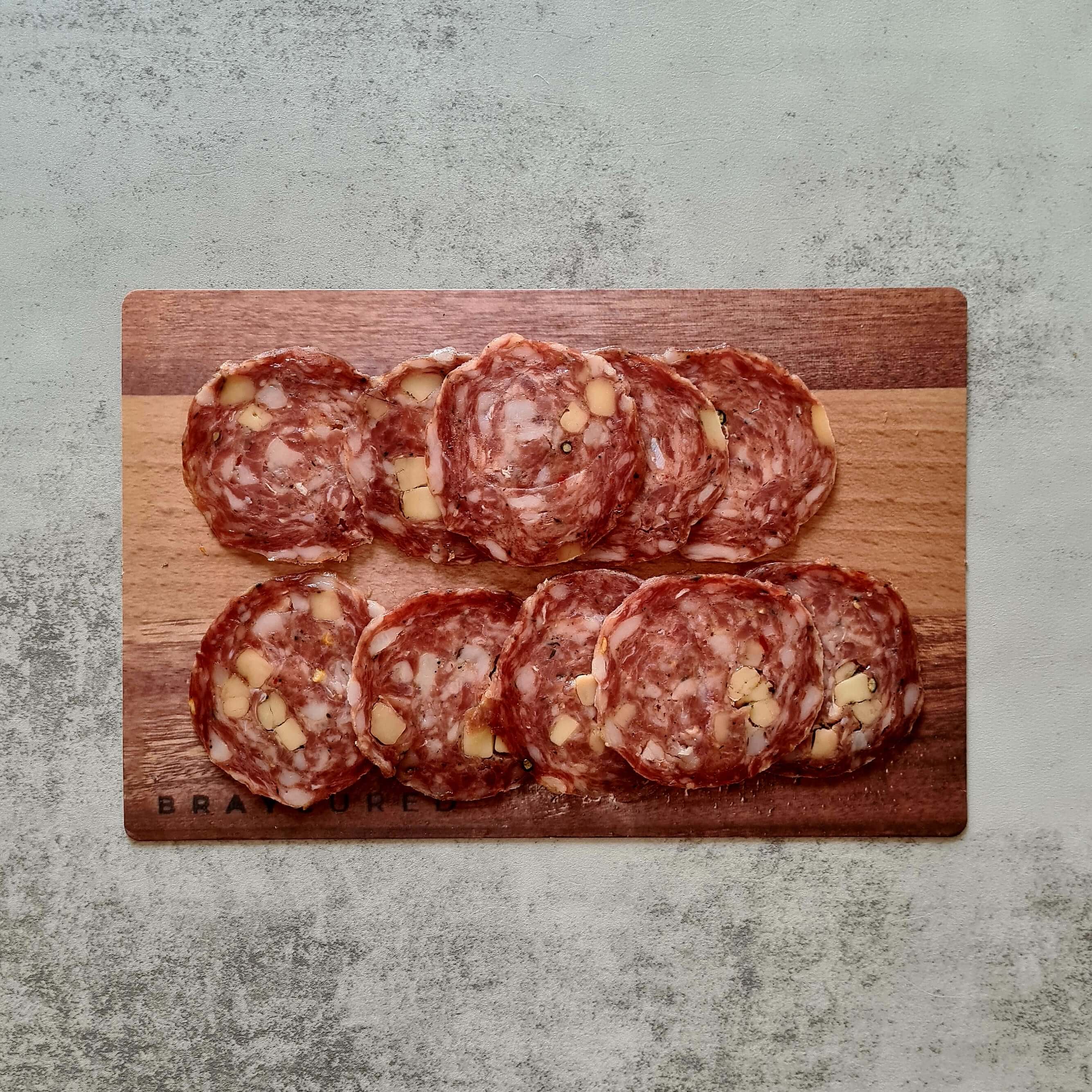 "Nicely formed, evenly cured, coarsely textured salami, deeply savoury - the cheese is an inspired addition - with a pleasing winey acidity and lift. The pepper is resonant, the salinity sound. The overall flavour is quite youthful, but also juicy".