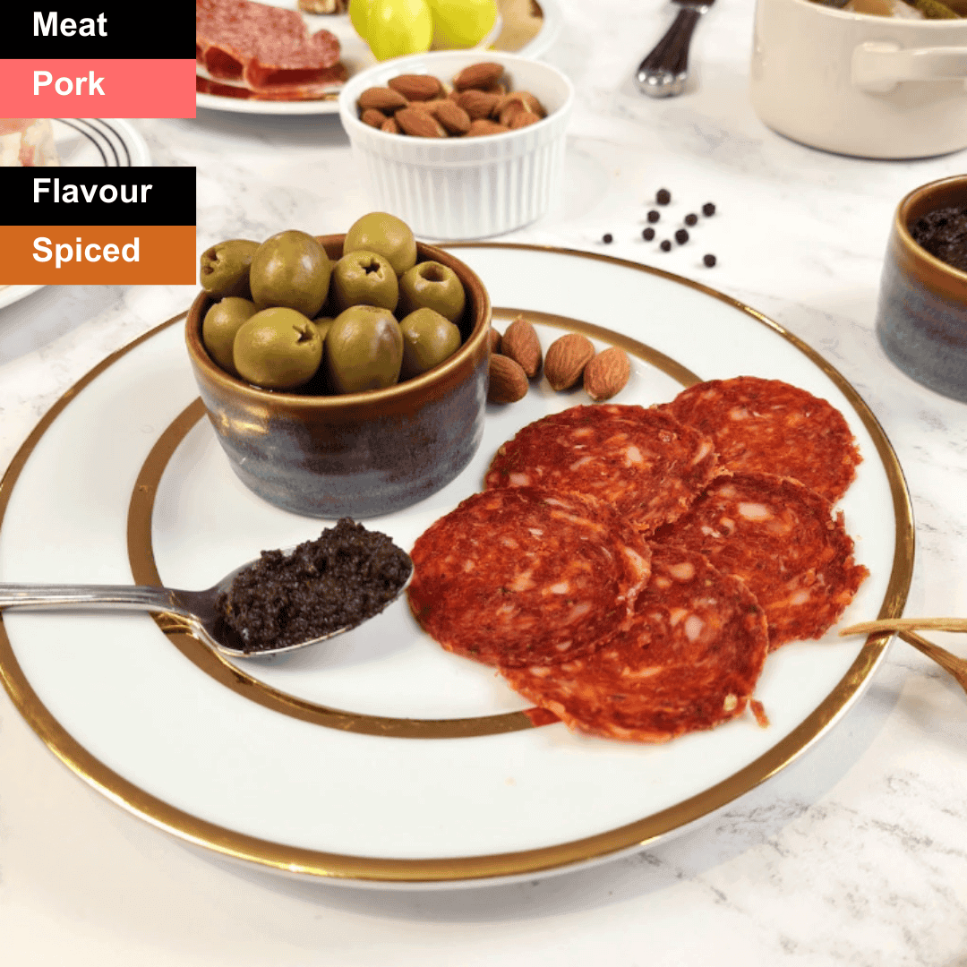 Coarsely ground pork, butchered nose to tail, is mixed with creamy back fat and cured with spices, centring on the essential smoked paprika. It's matured for months to intensify the flavour, then sliced for the grazing board, or the kitchen.