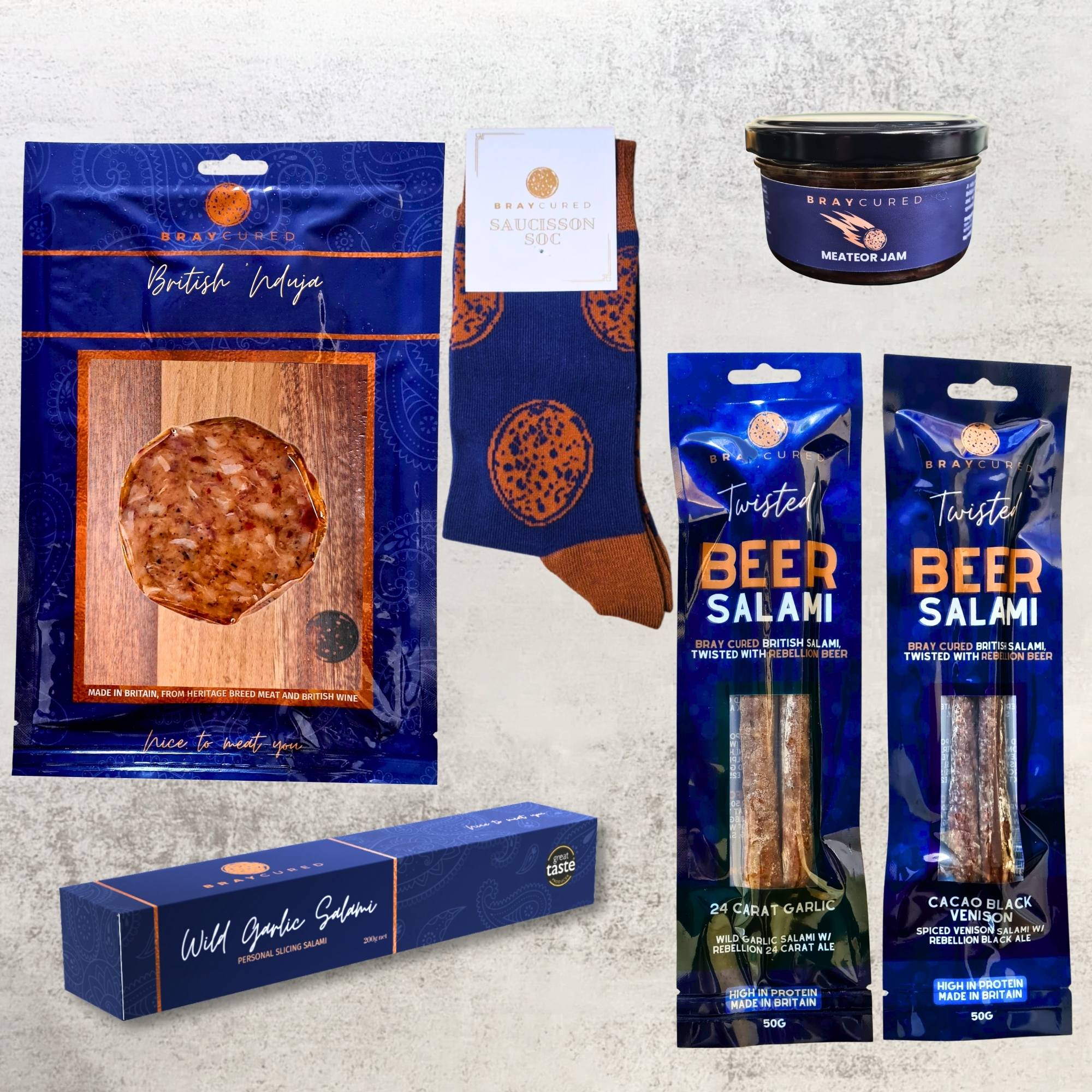 A 12" clear plastic egg containing a premium selection of five British charcuterie items. This includes a lucky dip selection of one Personal Slicing Salami and two Beer Salamis, plus one pair of socks, 'Nduja, and Meateor Jam. Packed into shredded blue paper in a brown cardboard postage box. Please note that there is no further wrapping inside the postage box.