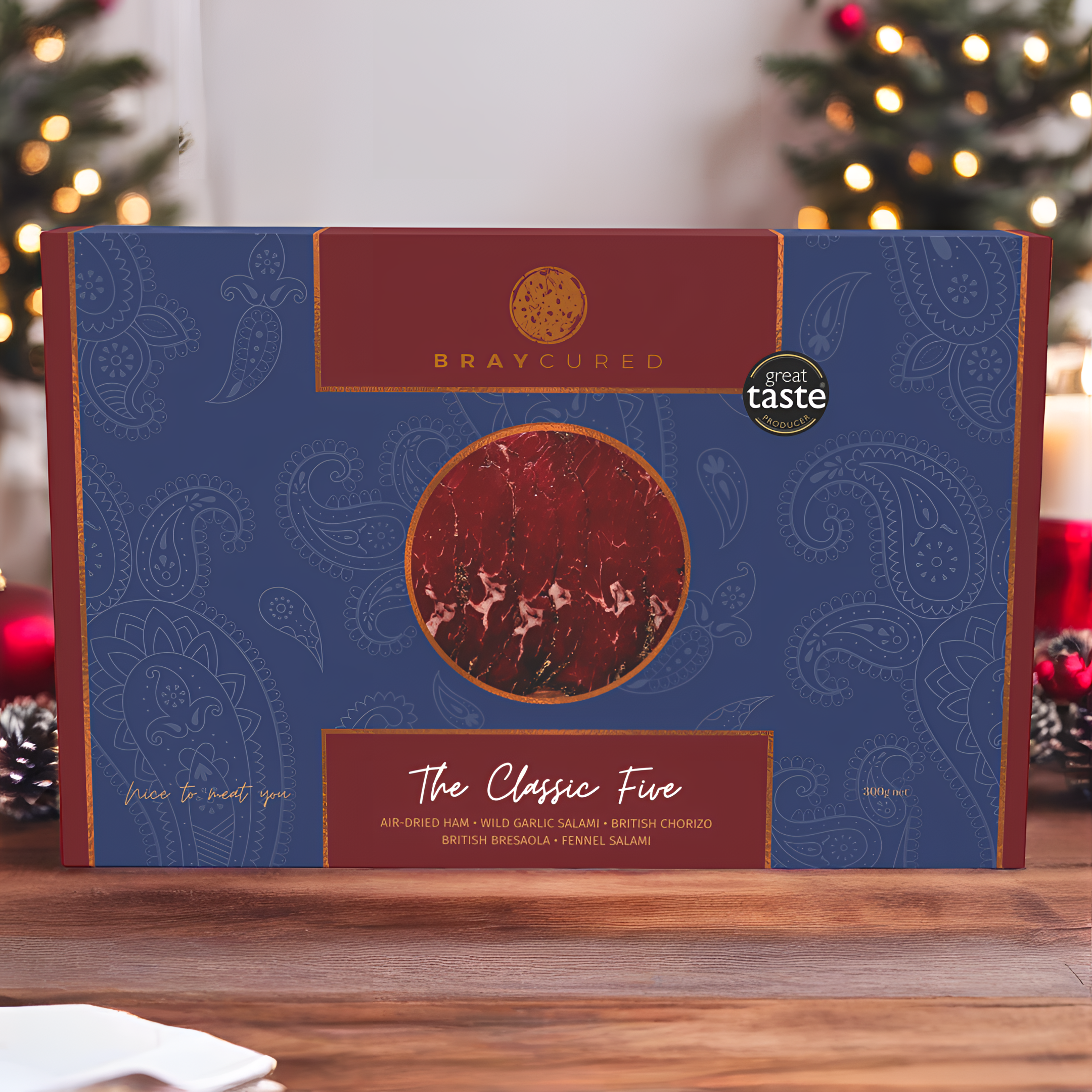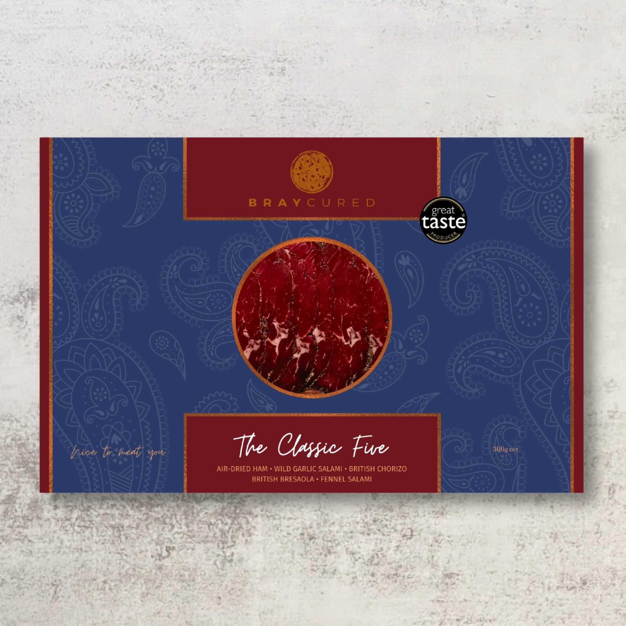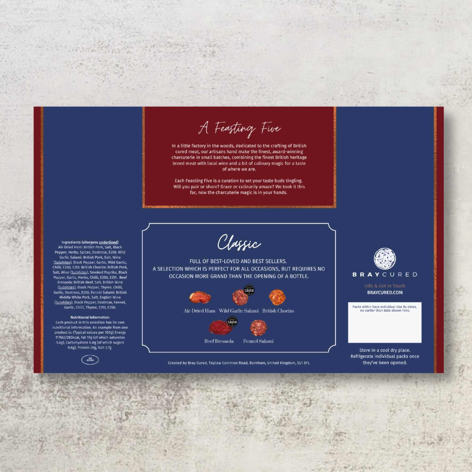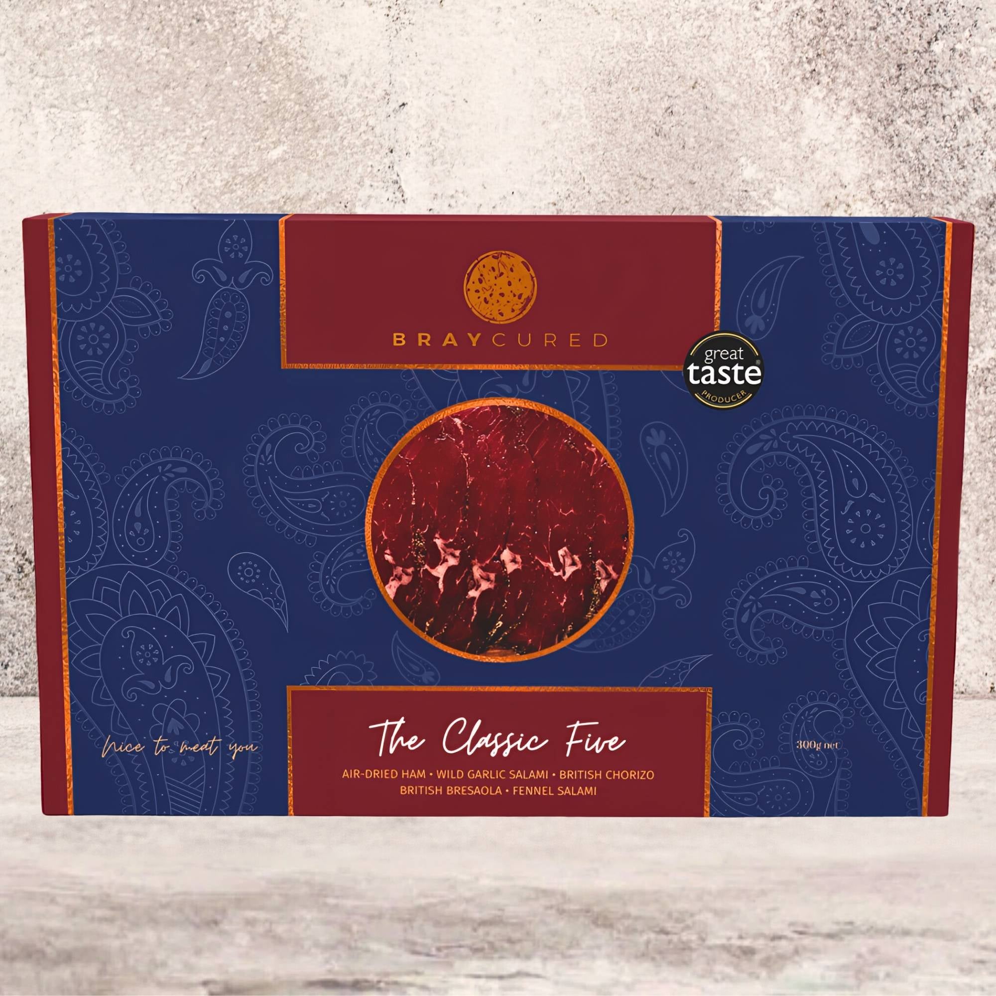 Continental charcuterie favourites and timeless flavours in this curation of award-winners. Beautifully gift boxed, this five combines a 60g pack of our Air-Dried Ham, Wild Garlic Salami, British Chorizo, Classic Bresaola and Fennel Salami.