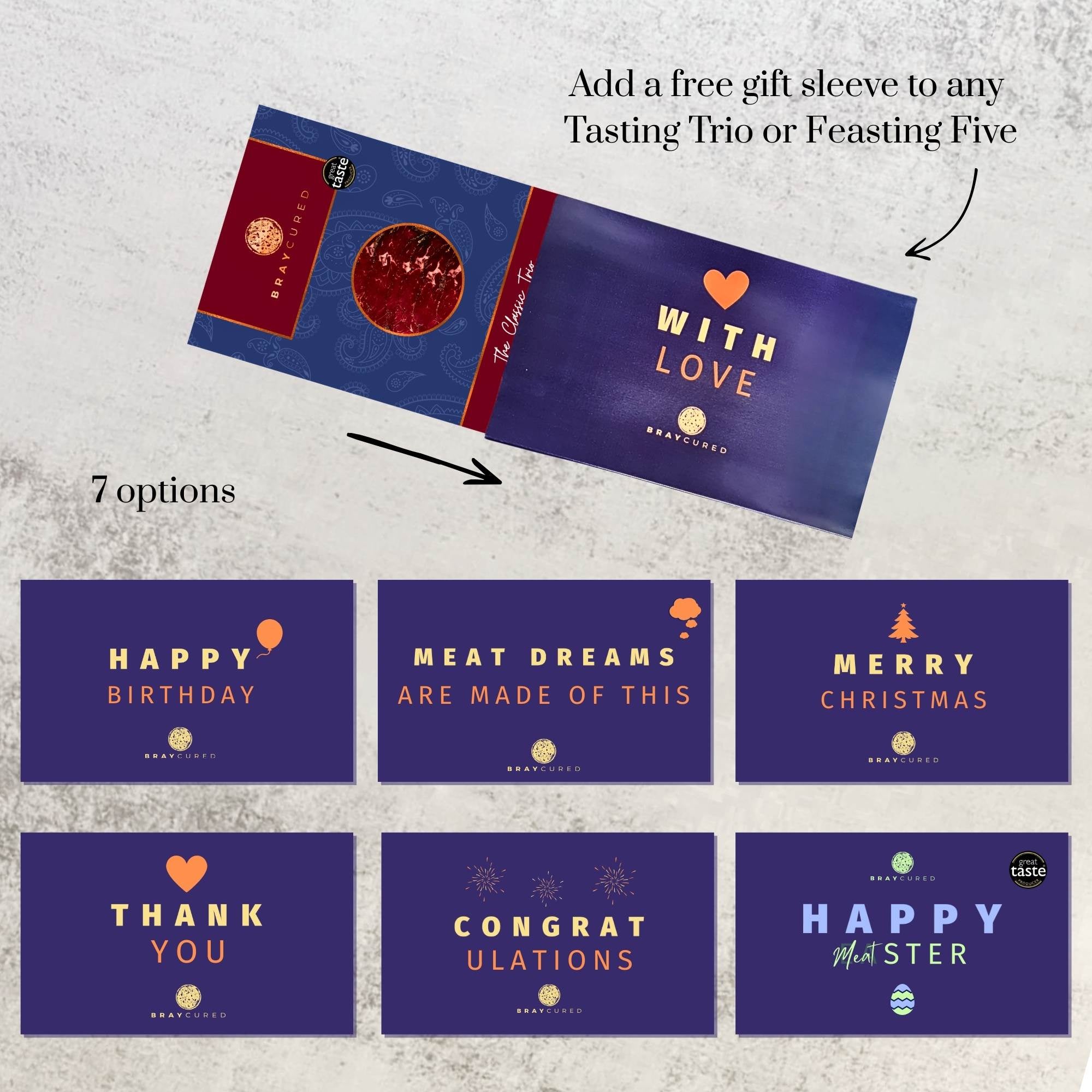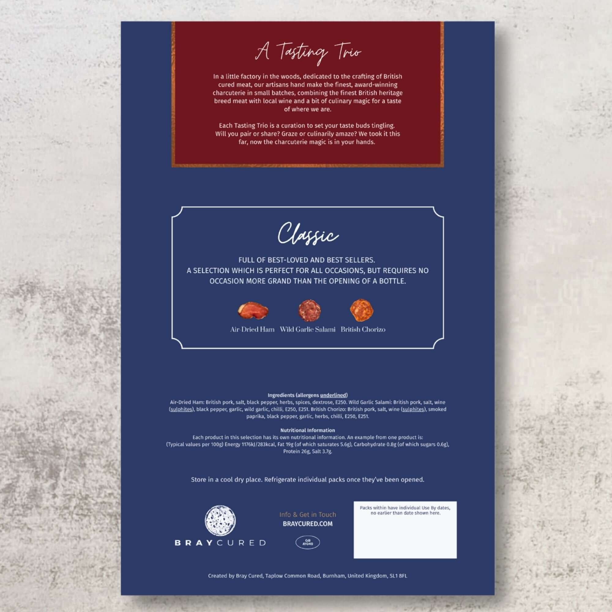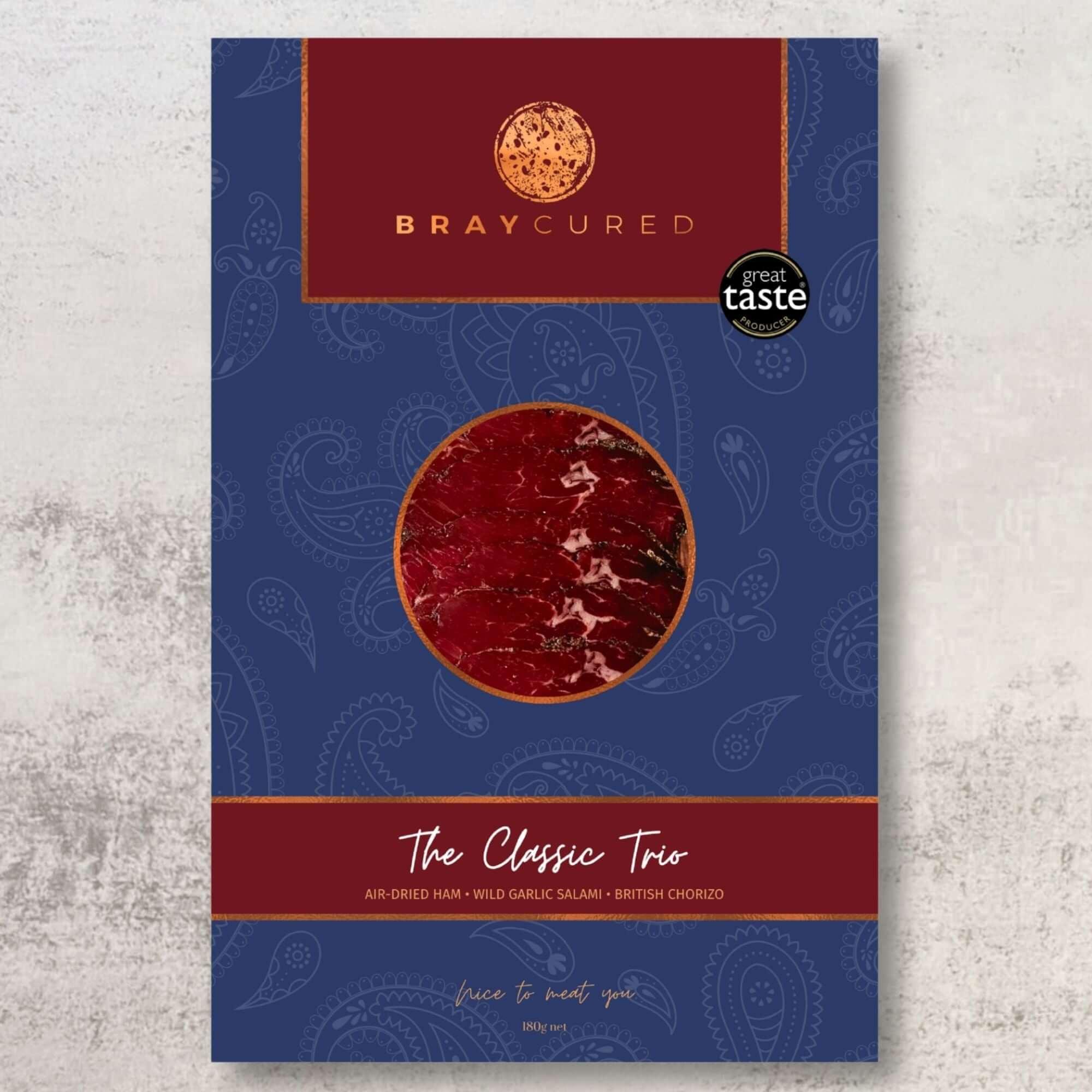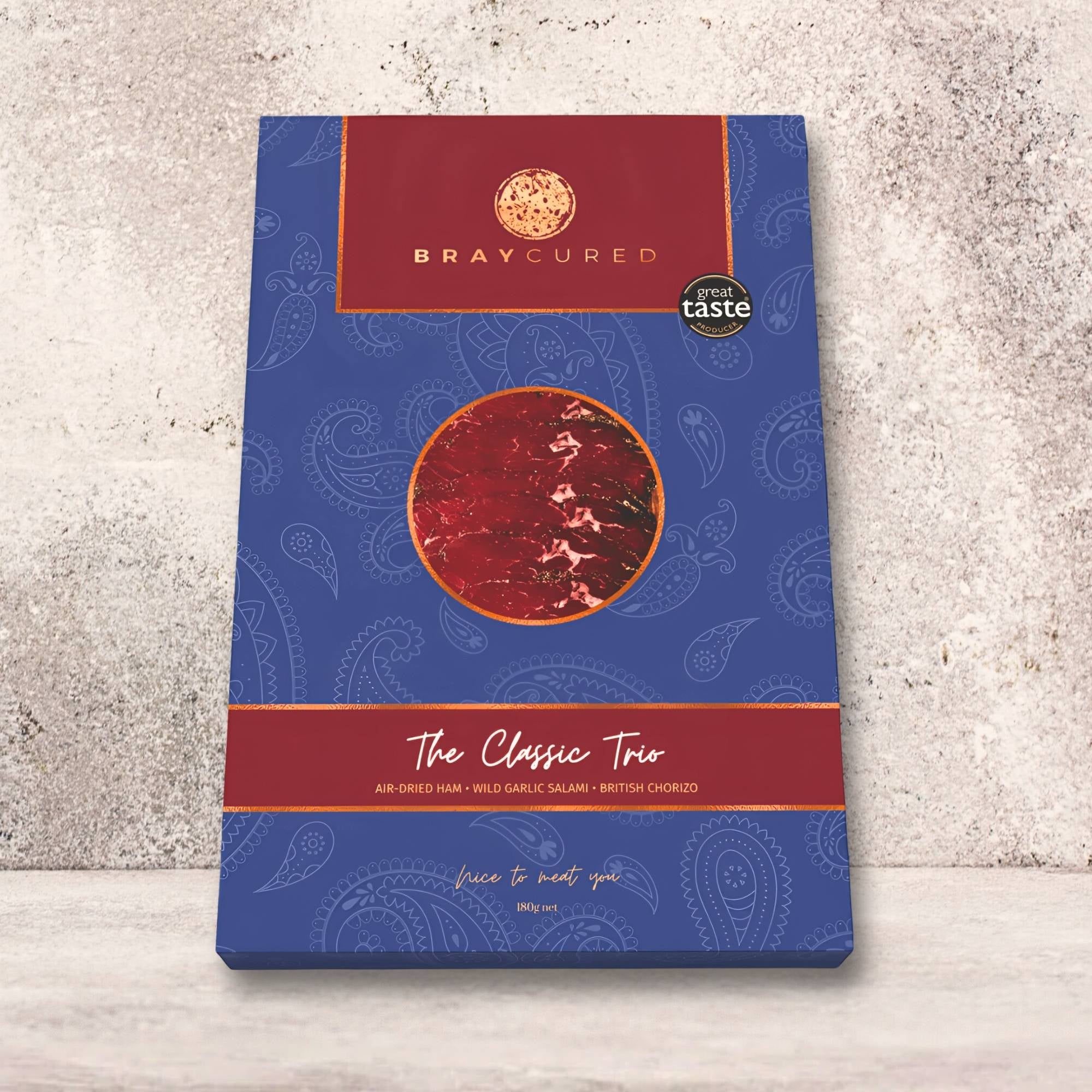 Continental charcuterie favourites and timeless flavours in this curation of award-winners. Beautifully gift boxed, this trio combines a 60g pack of our Air-Dried Ham, Wild Garlic Salami and British Chorizo.
