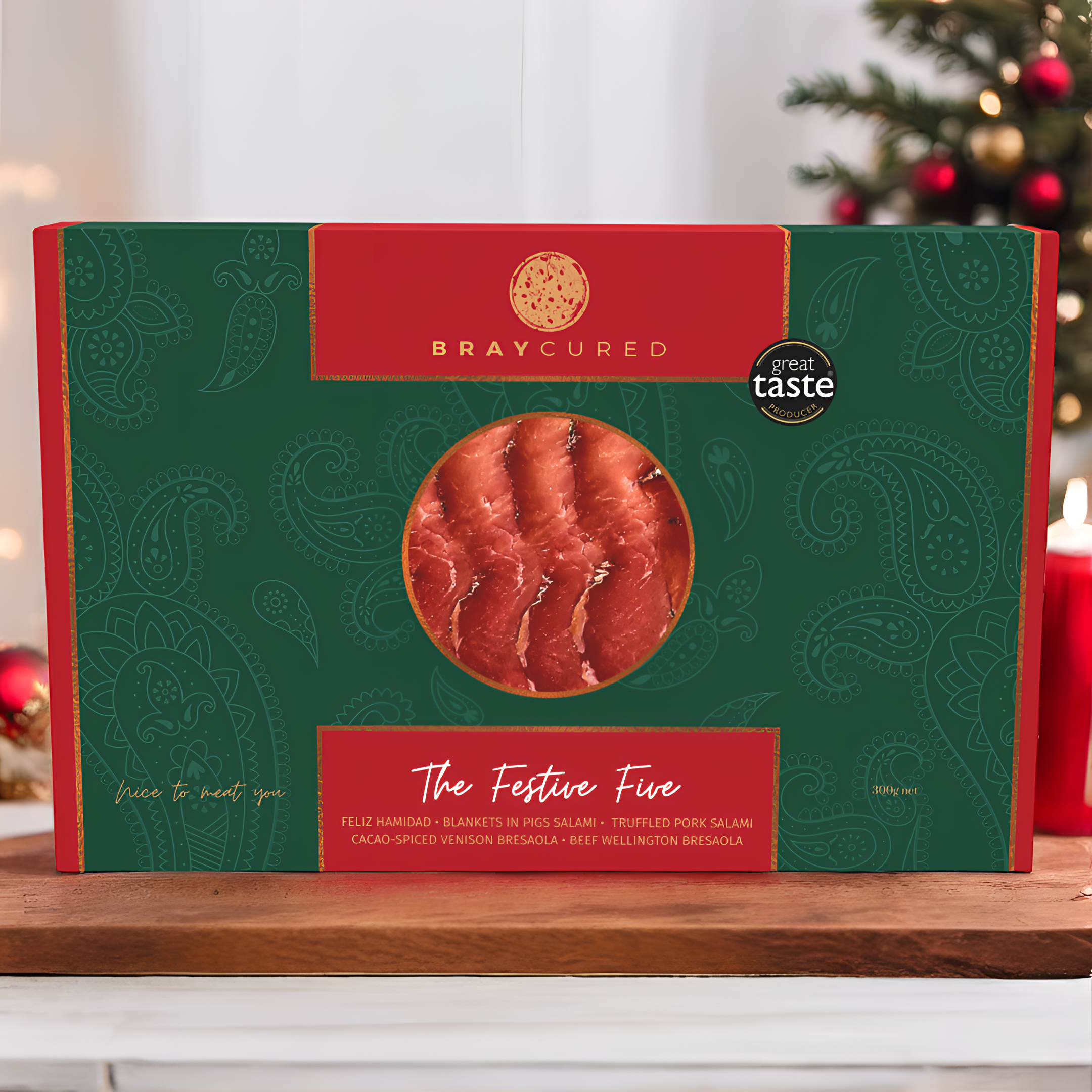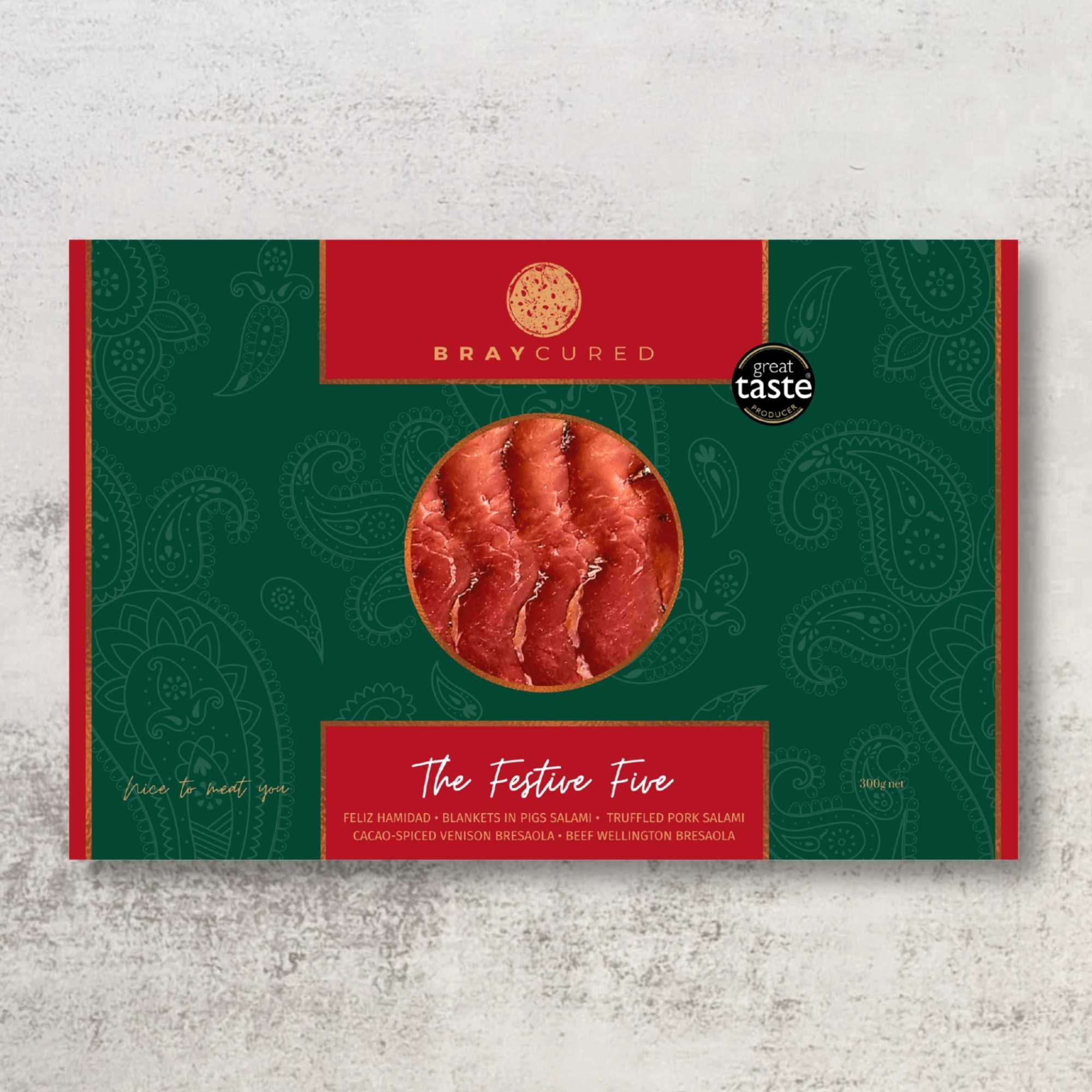Celebrate the season with this selection of Christmas-themed cures. Beautifully gift boxed, this five combines a 60g pack of our Cacao-Spiced Venison Bresaola, Pigs in Blankets Salami, Feliz Ham-idad, Beef Wellington Bresaola, Truffled Pork Salami.
