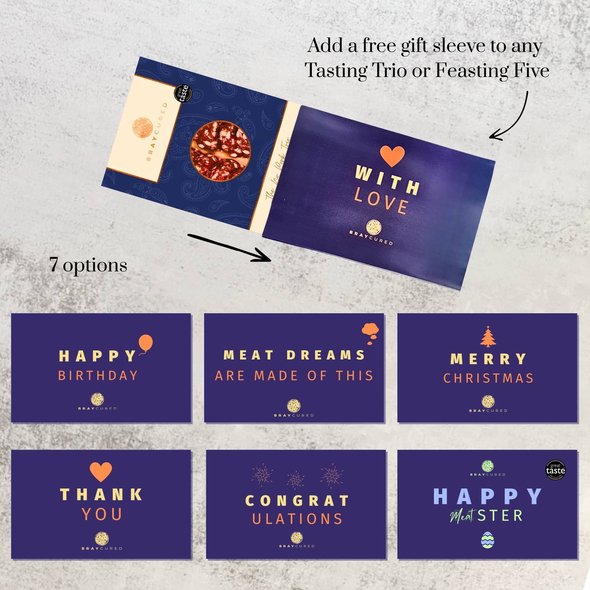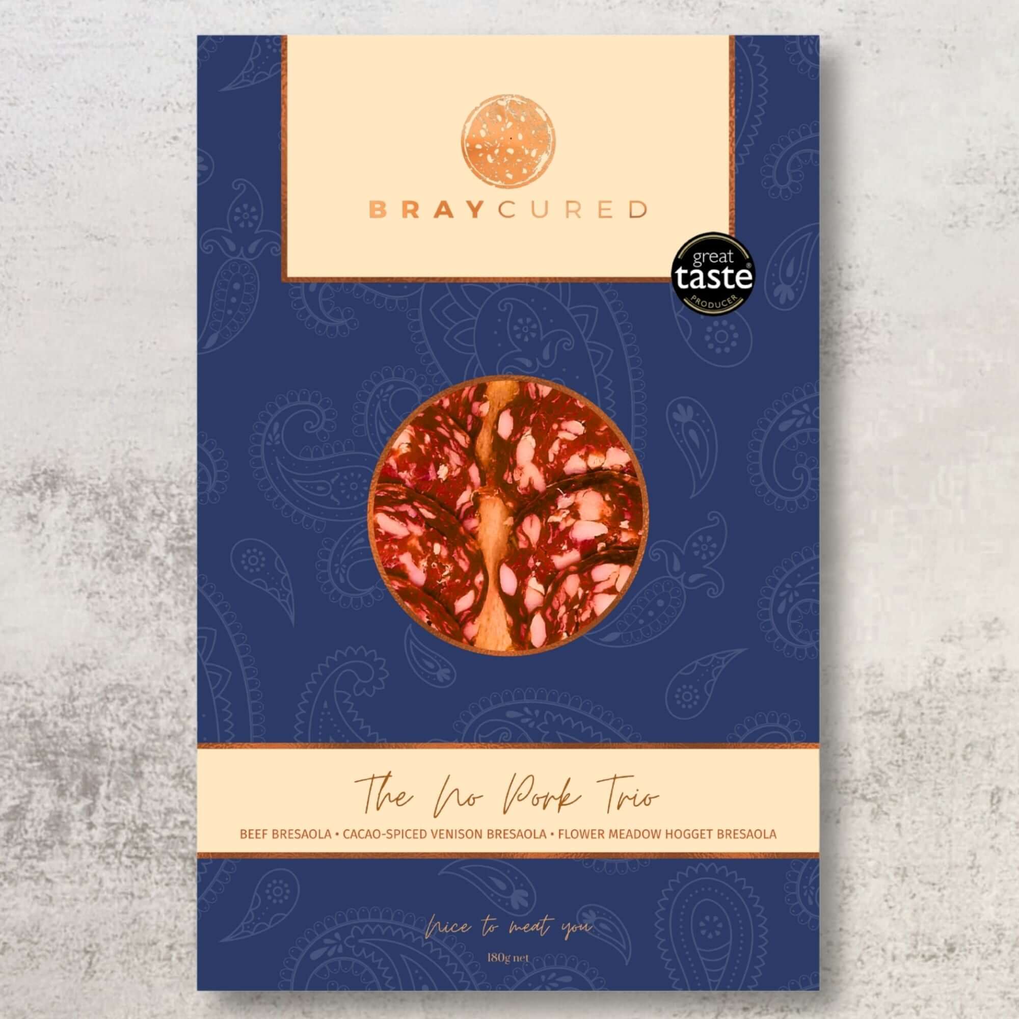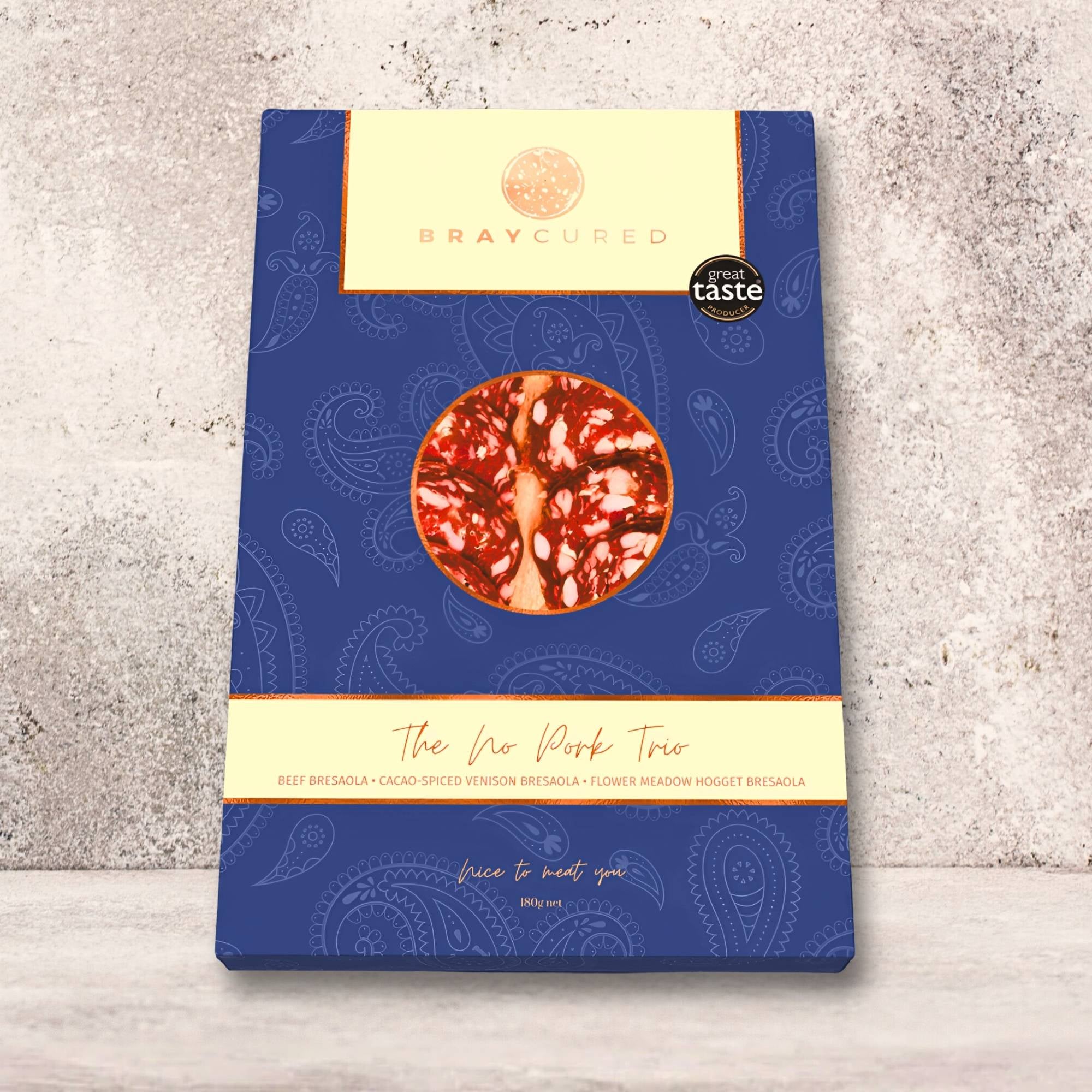 When pork shall not pass, this selection of superb charcuterie still will. Beautifully boxed, this trio combines a 60g pack of our Classic Bresaola, Cacao-Spiced Venison Bresaola and Hogget Bresaola.