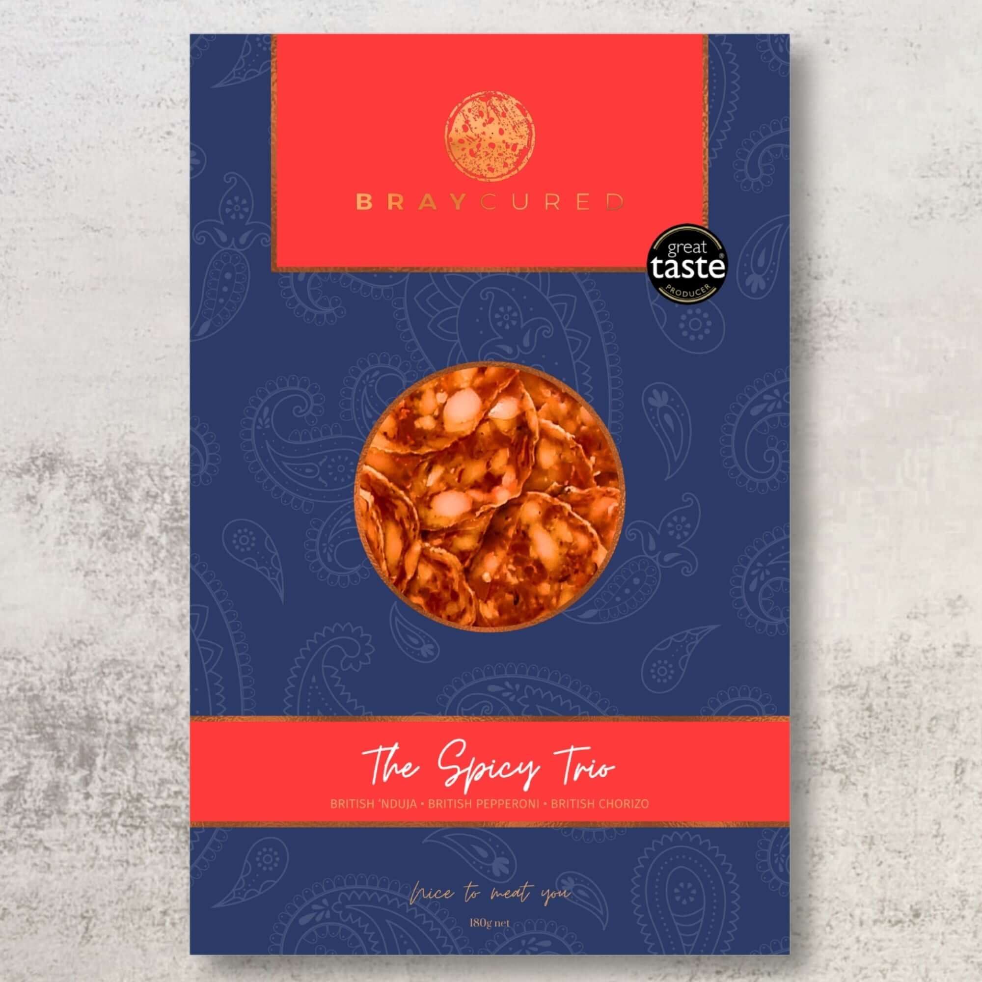 Some like it hot, and for them, a selection of our spicier charcuteries. Beautifully boxed, this trio combines a 60g pack of our British Chorizo and British Pepperoni, and 100g of our British 'Nduja.