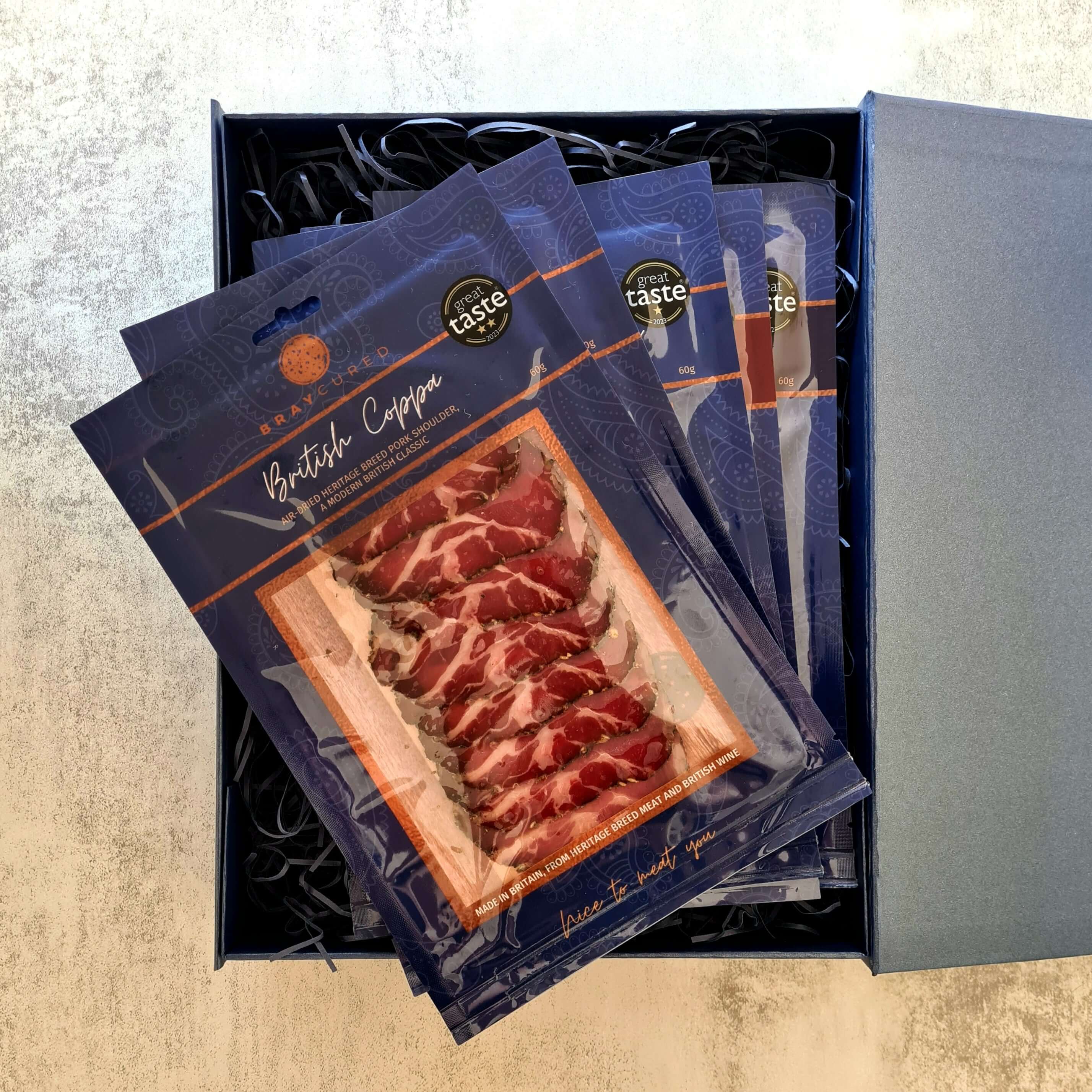 Gift the ultimate charcuterie treat to a foodie in the know. A mix of five, ten or twenty packs of our cured meats from our range, which includes sliced salamis and cured joints, award-winners, 'ndujas and spreadable salamis. Everything in the selection is small batch, hand made and created from British heritage breed meat and local wine.