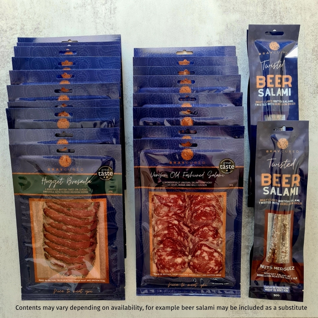 We'll curate a selection of meats into each box that gives the Bray Cured experience. If you have particular preferences for the box, add them into the notes section in the basket and we'll do our best to accommodate subject to availability.