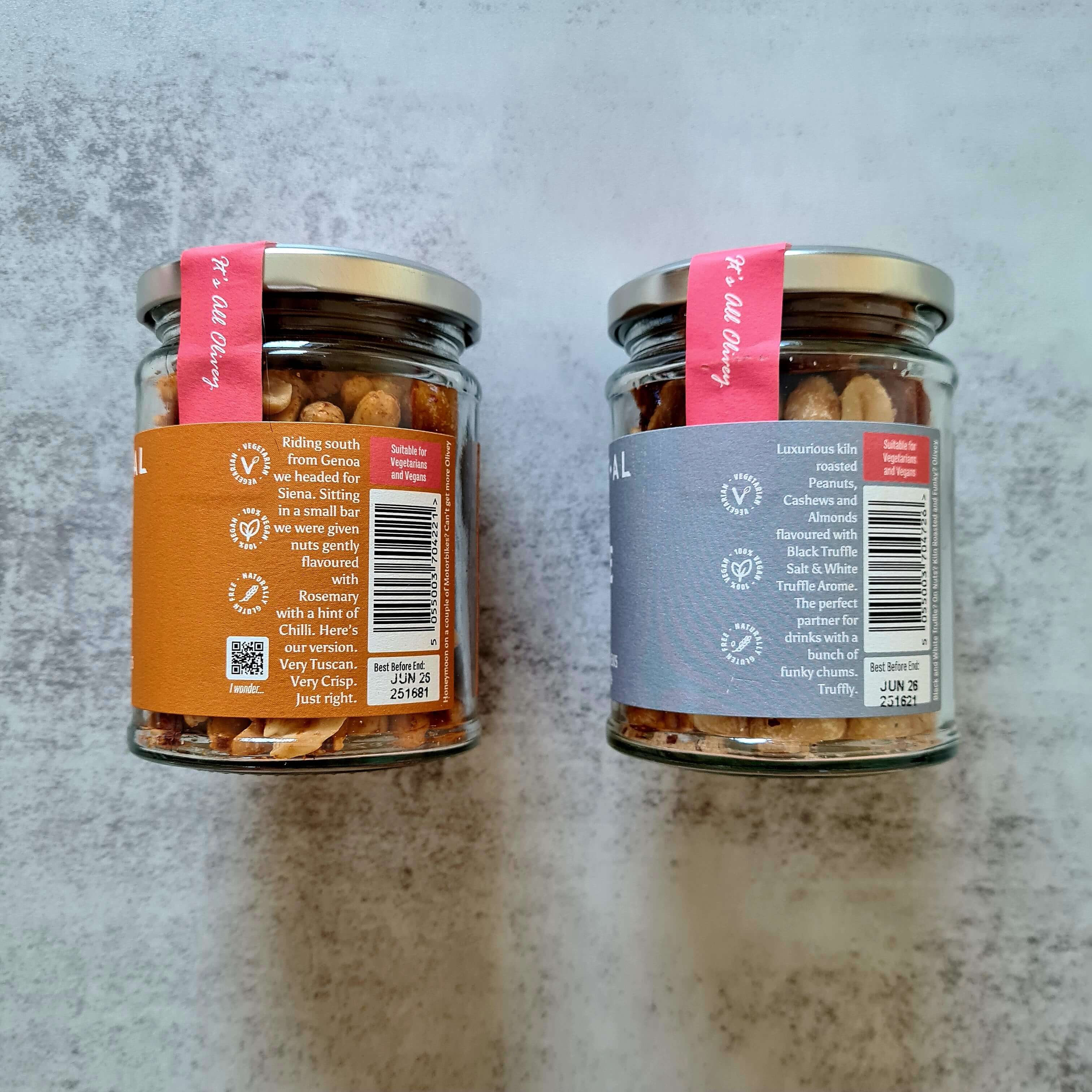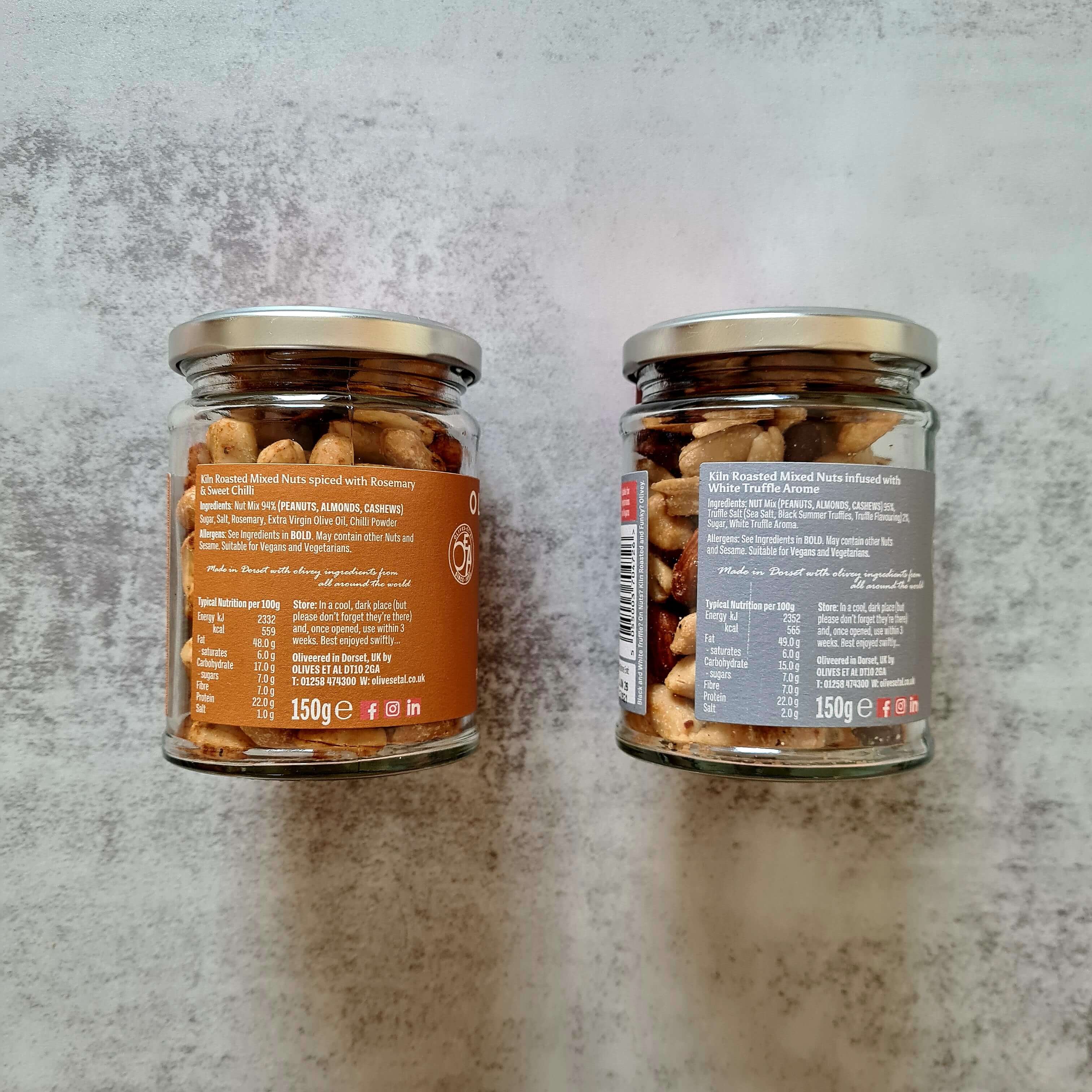Truffle Infused Mixed Nuts - Peanuts, Cashews, Truffle Salt 3% (Salt, Black Summer Truffles, Truffle Flavouring), Sugar, White Truffle Aroma, Extra Virgin Olive Oil