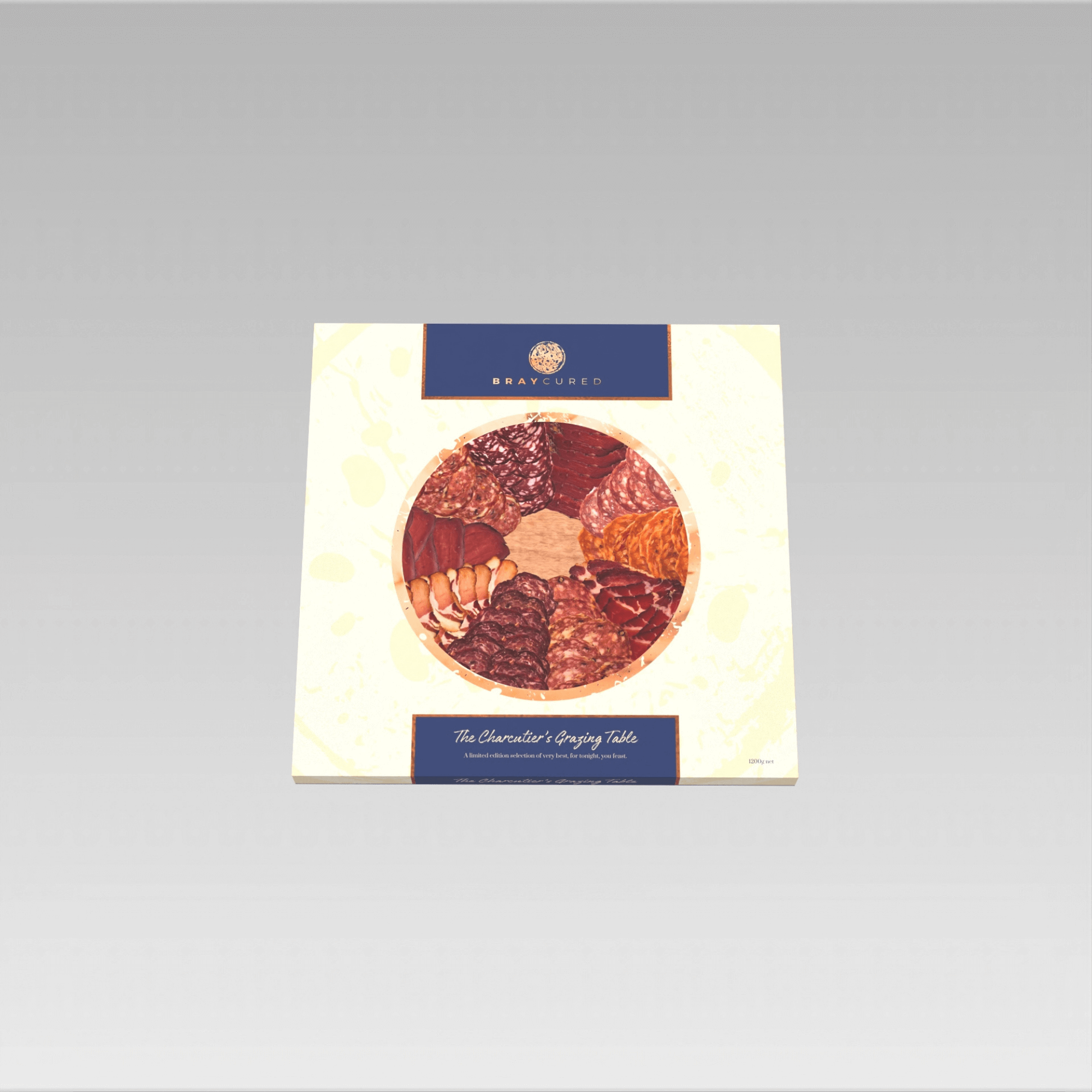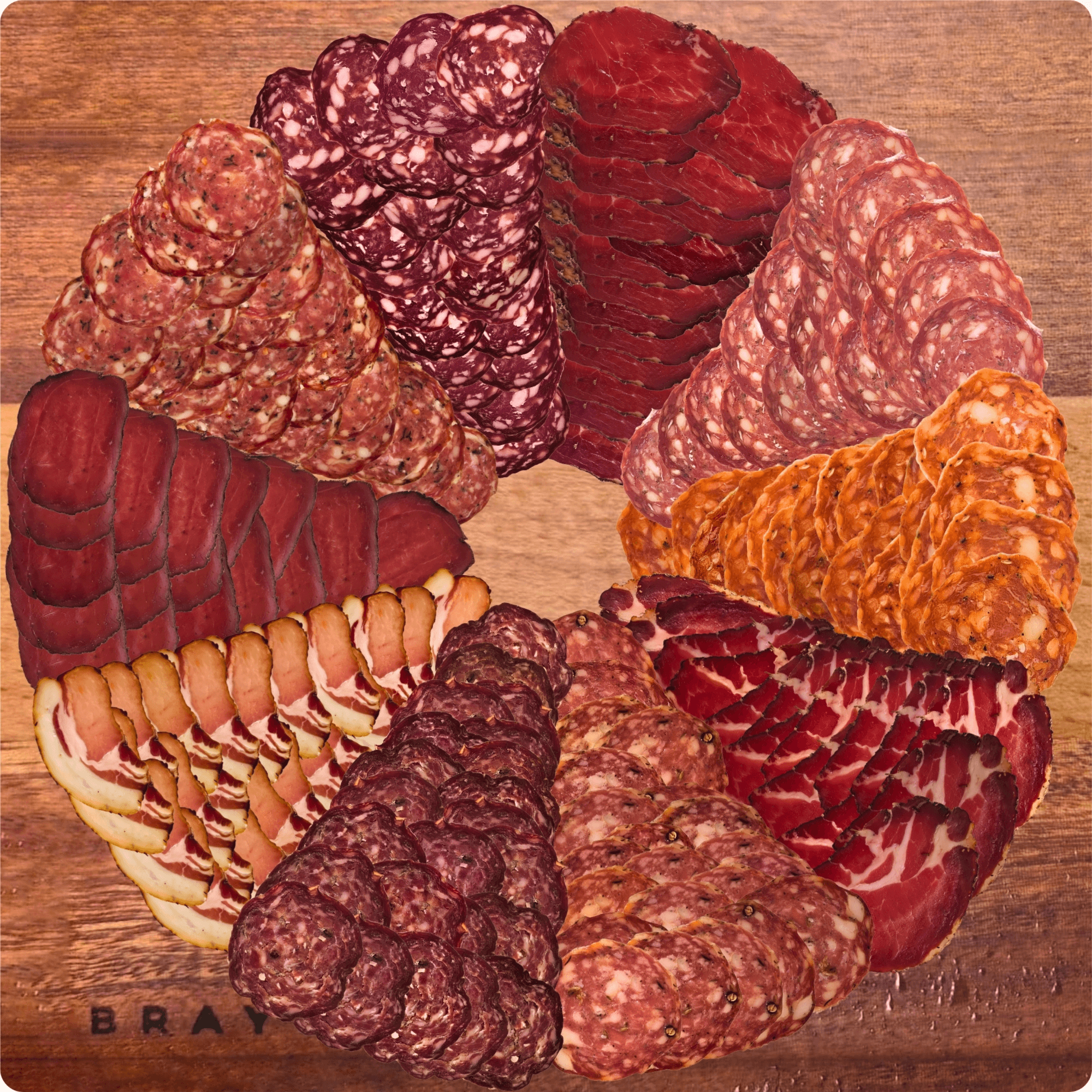 Prepare to be amazed, as we curate a range of ten cured meats and salamis onto a visually stunning table centrepiece that looks as good as it tastes. Complete with our trademark wood-effect backing board, ready to serve and dazzle your grazing guests. 43cm square board, 1kg of sliced meats.
